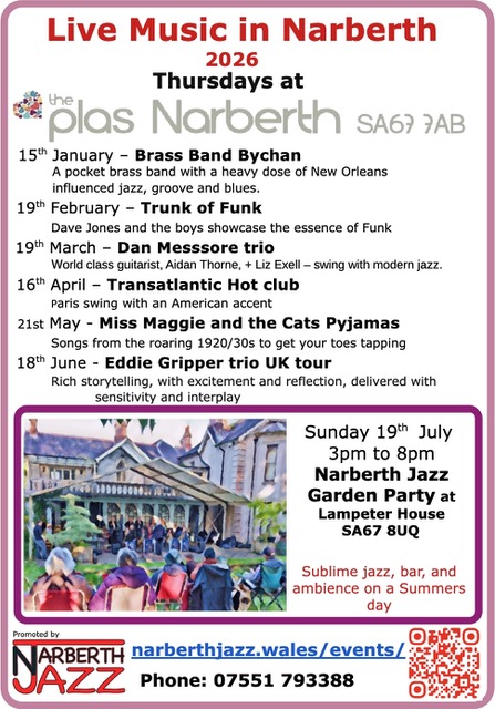 Welcome: Croeso: To the Narberth Jazz community music organisation, run by volunteers and presenting a variety of different music mainly Jazz and Jazz related.